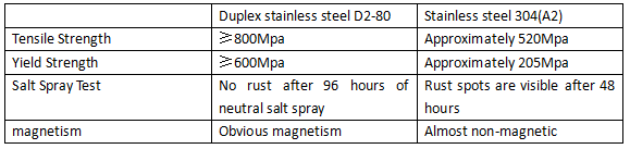 D2-80 es un acero inoxidable dúplex. "D2" representa el grupo de acero dúplex, y "80" indica una resistencia mínima a la tracción de 800 N/mm². Los tornillos de acero inoxidable dúplex D2-80 ofrecen una rosca antibloquea más fuerte que los tornillos SS304. La adición de 22% de cromo a D2-80 crea una película pasiva más densa que 304 acero inoxidable. Compuesto por aproximadamente 50% de acero inoxidable de austenita y 50% de ferrita, D2-80 combina la resistencia a la corrosión del acero inoxidable austenítico con alta resistencia y resistencia a la corrosión.